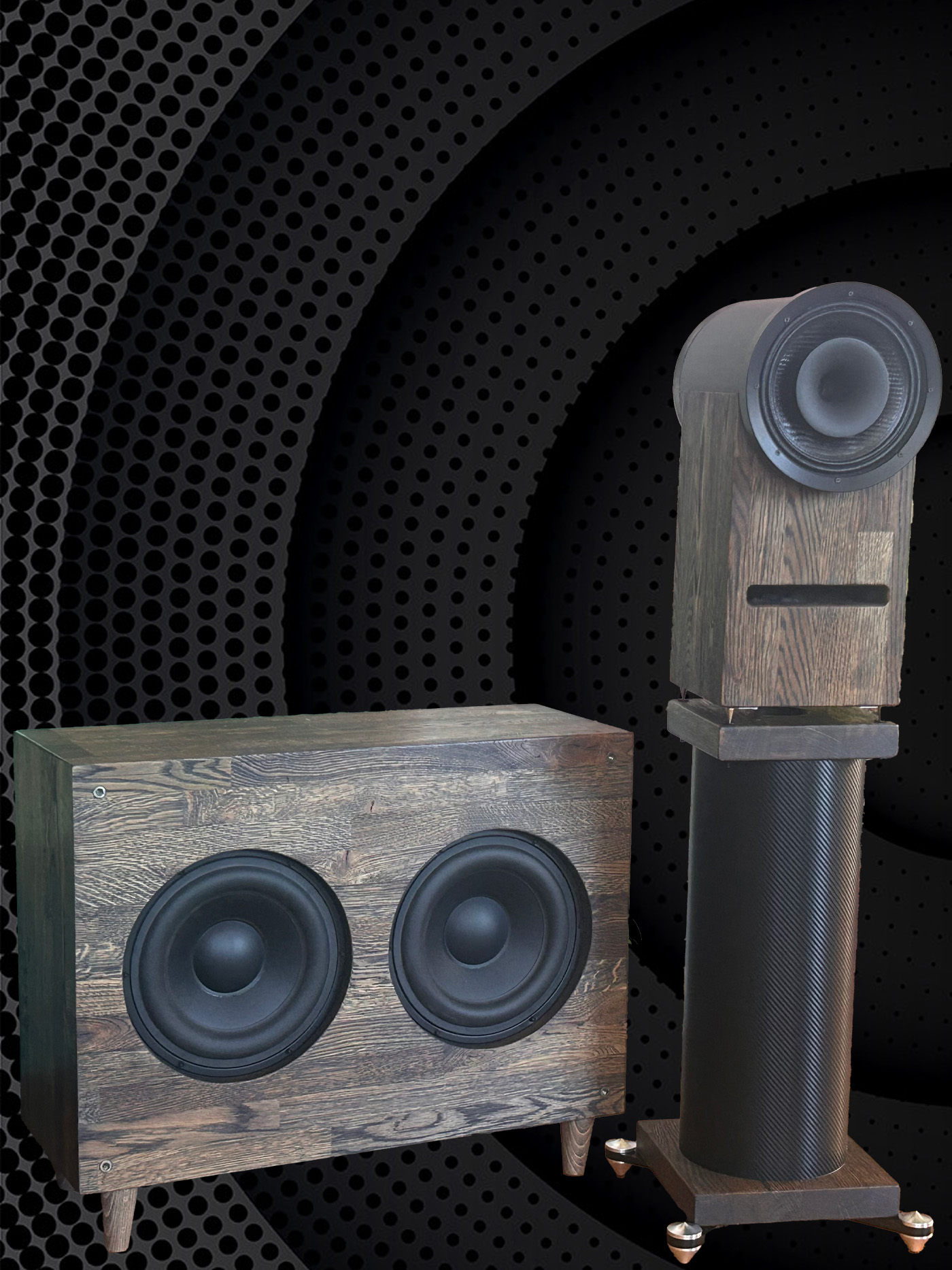 • Subwoofer Cube – 70 × 27 × 49 cm, drewno dębowe 4 cm, przetwornik Wavecor 27 cm z pasywną membraną, nóżki 8 cm umożliwiające pracę „w dół”